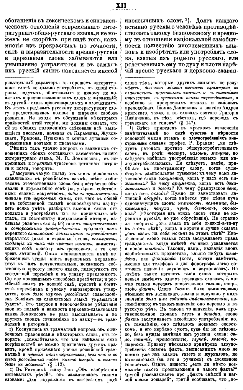 [1] Здесь приведем в кратком извлечении замечательный по силе чувства и верности основной мысли отзыв о злоупотреблениях иностранными словами профес. Р. Бранда: "не следует ратовать против общеупотребительных слов, в роде: театр, калоши, минута, но следует избегать употребления новых или малоупотребительных. Не следует, далее, прибегать к иностранному слову, когдасуществует равносильное туземное: к чему нам латинское слово