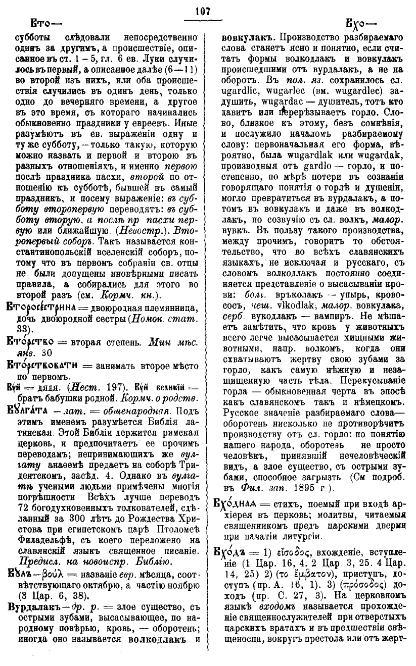 — др. р. = злое существо, с острыми зубами, высасывающее, по народному поверью, кровь, — оборотень; иногда оно называется волкодлак и вовкулак. Производство разбираемого слова станет ясно и понятно, если считать формы волкодлак и вовкулак происшедшими от вурдалак, а не наоборот. В пол. яз. сохранилось сл. ugardlic, wugarlec (вм. wugardlec) задушить, wugardac — душитель, тот, кто давит или перерезывает горло. Слово, близкое к этому, без сомнения, и послужило началом разбираемому слову: первоначальная его форма, вероятно, была wugardlak или wugardak, производные от gardlo — горло, и постепенно, по мере потери в сознании говорящего понятия о горле и душении, могло превратиться в вурдалак, а потом в вовкулак и даже в волкодлак, по созвучию со сл. волк, малор. вувк. В пользу такого производства, между прочим, говорит то обстоятельство, что во всех славянских языках, не исключая и русского, со словом волкодлак постоянно соединяется представление о высасывании крови: болг. връколак — упырь, кровосос, чеш. vlkodlak, малор. вовкулака, серб. вукодлак — вампир. Не мешает заметить, что кровь у животных всего легче высасывается хищными животными, напр., волком, когда они схватывают жертву свою зубами за горло, как самую нежную и незащищенную часть тела. Перекусывание горла — обыкновенная черта в эпосе как славянском, так и немецком. Русское значение разбираемого слова — оборотень нисколько не противоречит производству от сл. горло: по понятию нашего народа, оборотень — не просто человек, принявший нечеловеческий вид, а злое существо, с острыми зубами, способное загрызть. (См. подроб. в Фил. зап. 1895 г.).