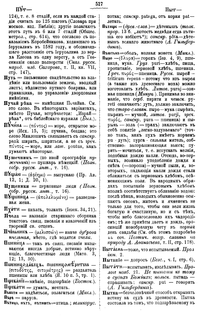 = испытать, исследовать. Пролог нояб. 21. Не пытати къ тому о судѣхъ Божiих; польск. пытаць – спрашивать; санскр. put – говорить (А. Гильфердинг).