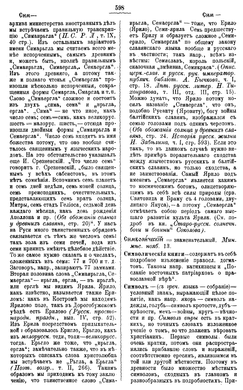 – (с греч. языка – собрание) = условный знак, выражающий человек понятие, как напр. якорь – символ надежды, голубь – символ кротости, дуб – крепости, меч – войны, круг – вечности и пр. «Символ веры» есть в кратких, но точных словах изложенное учение о том, во что должен веровать христианин. Первые символы были очень кратки, потом они распространялись прибавкой слов и выражений, соответственно ересям, являвшимся в той или другой местности. Поэтому в древности было множество местных символов, сходных в главном и разнообразных в подробностях. Приведение этих символов к единству произошло на первом и втором Вселенских соборах, когда составился нынешний Никеоцареградский символ. Но этот символ употребляется только в православной – восточной Церкви. Церковь западная употребляет другой символ, который хотя и называется «апостольским», но явился в первых раз в сочинениях Руфина, писателя 4-го века. Кроме символа Никеоцареградского и апостольского, в прав. Церкви известны символы: Неокесарийский – св. Григория Чудотворца, символ Афанасиев, т.е. Афанасия Александрийского. Когда третий Вселенский собор седьмым правилом запретил составлять новый символ веры, тогда новые вероопределения не вводились в символ, а излагались отдельно, в виде приложения к правилам соборов. Их можно читать к «Кн. правил».