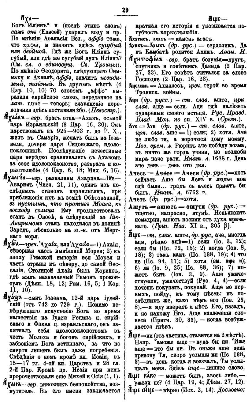 – ст. слав. аште, др.рус, аче, иногда аци, редко аце = 1) если (Ин. 3:12); если бы (Пс. 72:15); 2) когда (Иов. 8:18); 3) такъ какъ (Пс. 138:19); 4) что не (Пс. 94:11); 5) хотя (вм. аще и); 6) ли (Ин. 9, 25; Пс. 88:36); 7) может быть (Иона 3:9). Аще ужичествуеши, ужичествуй (Руфь 4:4) – если хочешь покупать, покупай. Аще бо во первых пойду, к тому несмь: в последних же, како вем его (Иов. 23:8), – я иду вперед – и нет Его, назад – и не нахожу Его. Аще извлечеши словеса (Притч. 30:33), – когда возбуждается гнев.