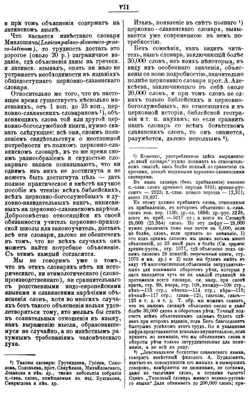 В наш словарь (без прибавления) внесено ц.-слав. слов древнего периода – 5101; древнерусских – 2525; ц.-слав. нового периода – 12,311; всего – 19,937. К этому должно прибавить слова, отнесенный к прибавлению, в котором объяснено: ц.-слав. слов нов. пер. – 1136; др.-сл. – 1656; др.-рус. – 3225, всего в приб. – 5017 сл.; а всего в Словаре – 25,000 (25,954) слов. Но эту цифру – 25,000 нужно увеличить тоже еще почти на 5000, если не более, слов, если принять во внимание, 1) что под одним словом мы даем весьма много объяснений, до 25 иной раз и более (См. оружие древнерусск., где объяснено под одним словом 28 понятий; отреченные книги и мн. др.) и 2) если мы будем иметь в виду те многочисленные объяснения затруднительных для понимания оборотов речи, которые у нас находятся чуть не на каждой странице на протяжении всего словаря, см. напр., при слове врата, вчера, вхожду, век, венец, вера, вечный, глава, глаголю, глас и т.д. и т.д. Т. обр. мы можем сказать, что в нашем словаре объяснено около и даже более 30000 слов и оборотов речи. Точный подсчет всем объясненным словам будет сделан при втором издании, если Бог благословит быстрым успехом этот труд. Но и указанная цифра представляется довольно внушительною, если принять во внимание, что мы объясняем слова и обороты речи только затруднительные для понимания, а не все к ряду.