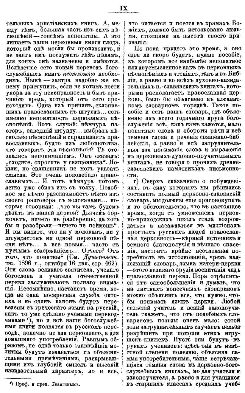 Но пока придет это время, а оно едва ли скоро будет, нужно пособие, в котором все наиболее непонятное или двусмысленное как в церковных песнопениях и чтениях, так и в Библии, а равно и во всех духовно-назидательных ц.-славянских книгах, которыми располагает православная церковь, было бы объяснено в алфавитном словарном порядке. Такое пособие и есть наш словарь, где объяснены из всего годичного круга богослужения все, как нам кажется, малопонятные слова и обороты речи и все темные слова и речения священно-библейские, а равно и все затруднительные для понимания слова и выражения в церковных духовно-поучительных книгах, не говоря о прочих древнеславянских памятниках письменности.