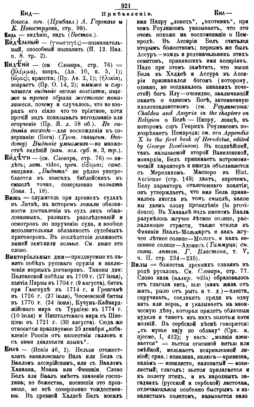 Ис. 46:1). Нельзя отожествлять вавилонского Вила или Бела с Ваалом ассирийским, или с Ваалом Ханаана, Моава или Финикии. Слово Бел или Ваал имеет значение господина; но божества, носившие это прозвище, не все совершенно тождественны. В древней Халдее Бел носил имя Нипру «ловец», «охотник», при чем Роулинсон указывает, что это очень похоже на воспоминание о Немвроде. В Ассирии Бел считался вторым божеством; первым же был Ассур – вождь и родоначальник этих семитов, принявших имя ассириян. Надо при этом заметить, что выше Бела в Халдее и Ассура в Ассирии признавался богом (которому, однако, не воздавалось никаких почестей) бог Илу – очевидно, заключавший память о едином Боге, затемненную идолопоклонством (