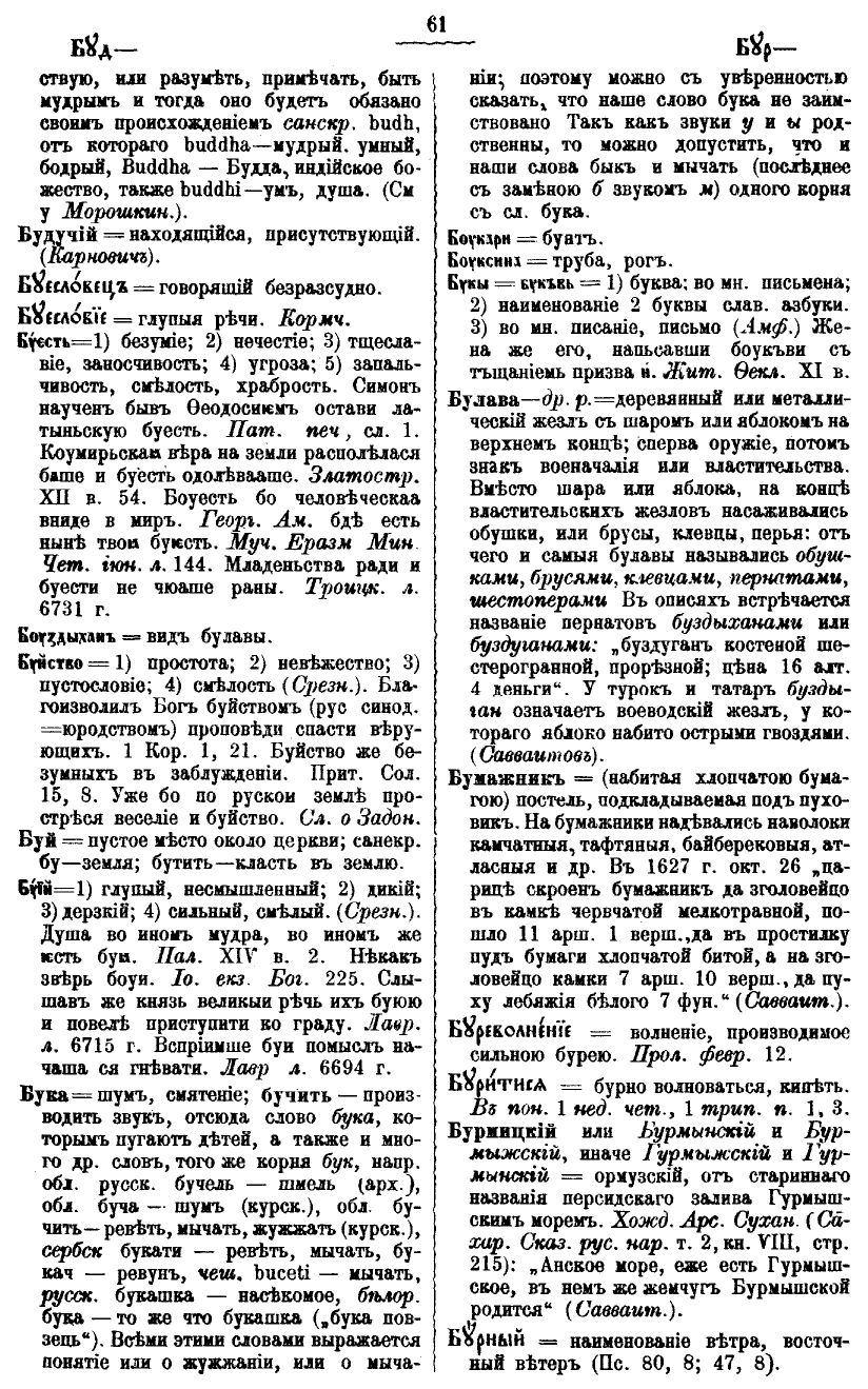 = шум, смятение; бучить – производить звук, отсюда слово бука, которым пугают детей, а также и много др. слов того же корня бук, напр. обл. русск. бучель – шмель (арх.), обл. буча – шум (курск.), обл. бучить – реветь, мычать, жужжать (курск.), сербск. букати – реветь, мычать, букач – ревун, чеш. buceti – мычать, русск. букашка – насекомое, белор. бука – то же что букашка („бука повзець“). Всеми этими словами выражается понятие или о жужжании, или о мычании; поэтому можно с уверенностью сказать, что наше слово бука не заимствовано. Так как звуки „у“ и „ы“ родственны, то можно допустить, что и наши слова бык и мычать (последнее с заменой „б“ звуком „м“) одного корня со сл. бука.