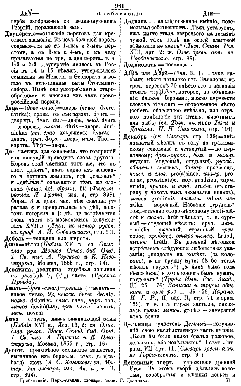 - (см. Словарь, стр. 139) = двенадцатый месяц в году по гражданскому счислению и четвертый – по церковному; древ. русск., болг. и малор. студен (студеный, студьный), русск., област. зимник, болгар. просинец, чешс. и слов. pro(a)sínec, иллир. prosinac, proszina(e)c, пол. grudzien, карн. grudn, кроат. и венд. gruden (в старину у чехов так назывался январь), литов. grodinnis, латыш. salnas или sallas – морозный. Название «грудень» тождественно старонемецкому herti-mânot и сканд. hrût mânuthr, т. е. суровый = студеный месяц; срав. лат. crudelis – ужасный, страшный, греч. κρύος, κρυώδης, старонемец. hruod, англос. hrêth. В древней летописи встречаем следующие любопытные указания: «поидоша на колѣхъ (на колесах), а по грудну пути; бѣ бо тогда мѣсяцъ груденъ»; «а зима была гола (бесснежна) и ходъ конемъ былъ нужнъ, грудоватъ» (Труды Имп. Рос. Акад., III, 25-76; Записки и труды общ. ист. и древ. рос. II, 49-59; Карамз. И. Г. Р., II, изд. II, стр. 71 и прим. 159), т. е. от стужи застыла, смерзлась грязь; литов. grodas – замерзший ком земли.