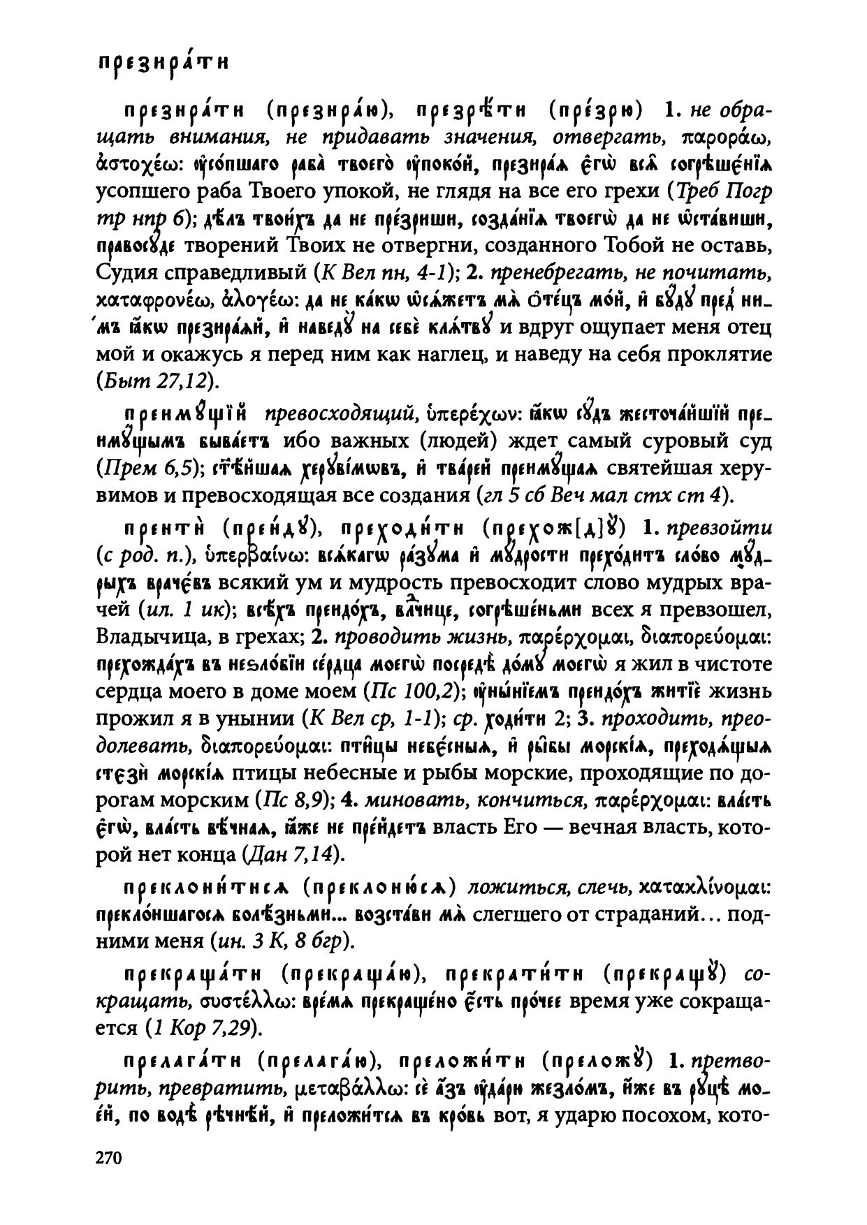 1.превзойти (с род.п.), ύπερβαίνω: всѧ́кагѡ ра́зꙋма и̂ мꙋ́дрости прехо́дитъ сло́во мꙋ́дрыхъ врачє́въ всякий ум и мудрость превосходит слово мудрых врачей (ил. 1 ик); всѣ́хъ преидо́хъ, влⷣⷣчице, согрѣше́ньми всех я превзошел, Владычица, в грехах; 2.проводить жизнь, παρέρχομαι, διαπορεύομαι: прехожда́хъ въ неѕло́бїи се́рдца моегѡ̀ посредѣ до́мꙋ моегѡ̀ я жил в чистоте сердца моего в доме моем (Пс.100:2); ѹ̂ны́нїемъ преидо́хъ житїе жизнь прожил я в унынии (КВел ср, 1–1); ср. ходи́ти 2; 3.проходить, преодолевать, διαπορεύομαι: пти̑цы небє́сныѧ, и̂ ры̑бы морскі́ѧ, преходѧ́щыѧ стєзѝ морскі́ѧ птицы небесные и рыбы морские, проходящие по дорогам морским (Пс.8:9); 4.миновать, кончиться, παρέρχομαι: вла́сть є̂гѡ̀, вла́сть вѣ́чнаѧ, ꙗже не пре́йдетъ власть Его – вечная власть, которой нет конца (Дан.7:14).