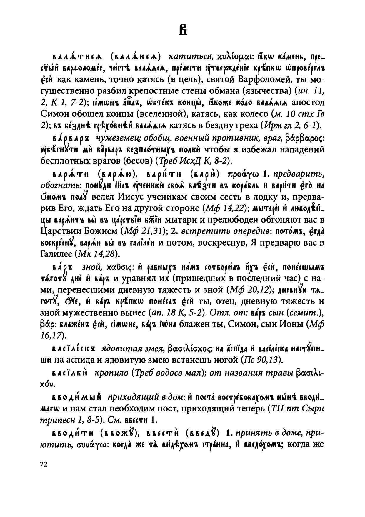 чужеземец; обобщ. военный противник, враг, βάρβαρος: оу҆бѣ́гнꙋти мѝ ва̑рваръ безпло́тныхъ полкѝ чтобы я избежал нападений бесплотных врагов (бесов) (Треб ИсхД К, 8–2).