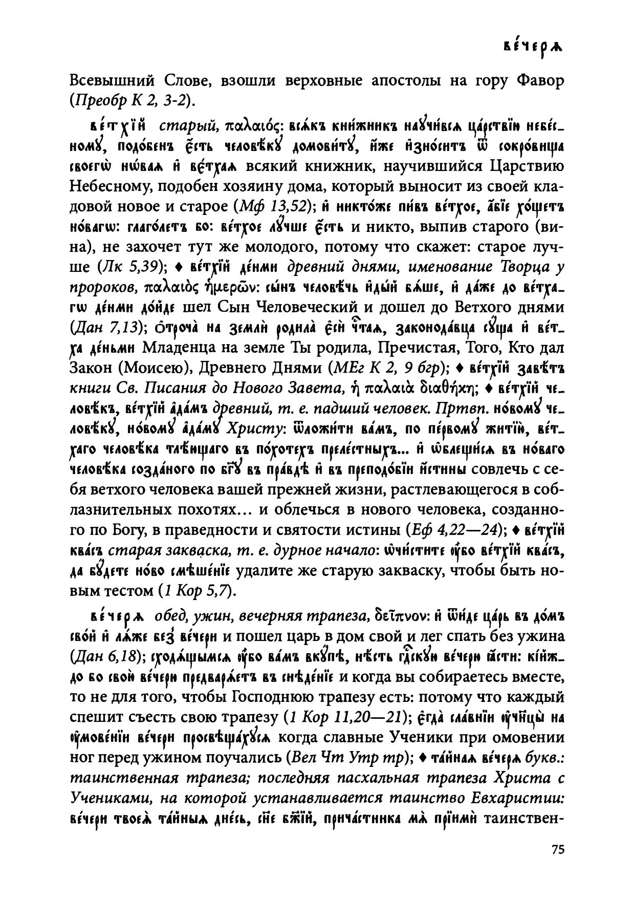 ѿложи́ти ва́мъ, по пе́рвомꙋ житїю̀, ве́тхаго человѣ́ка тлѣ́ющаго въ по́хотехъ преле́стныхъ... и҆ ѡ҆блещи́сѧ въ но́ваго человѣ́ка созда́ного по бг҃ꙋ въ пра́вдѣ и҆ въ преподо́бїи и҆́стины совлечь с себя ветхого человека вашей прежней жизни, растлевающегося в соблазнительных похотях... и облечься в нового человека, созданного по Богу, в праведности и святости истины